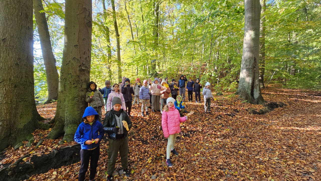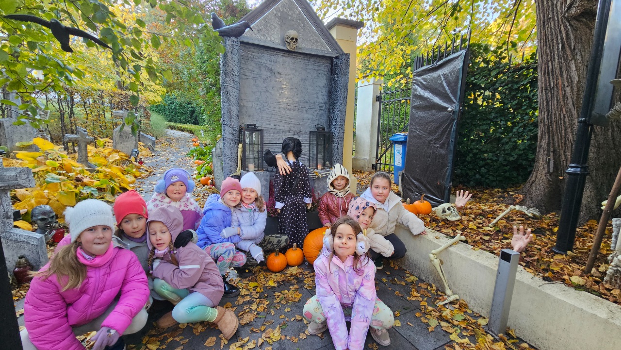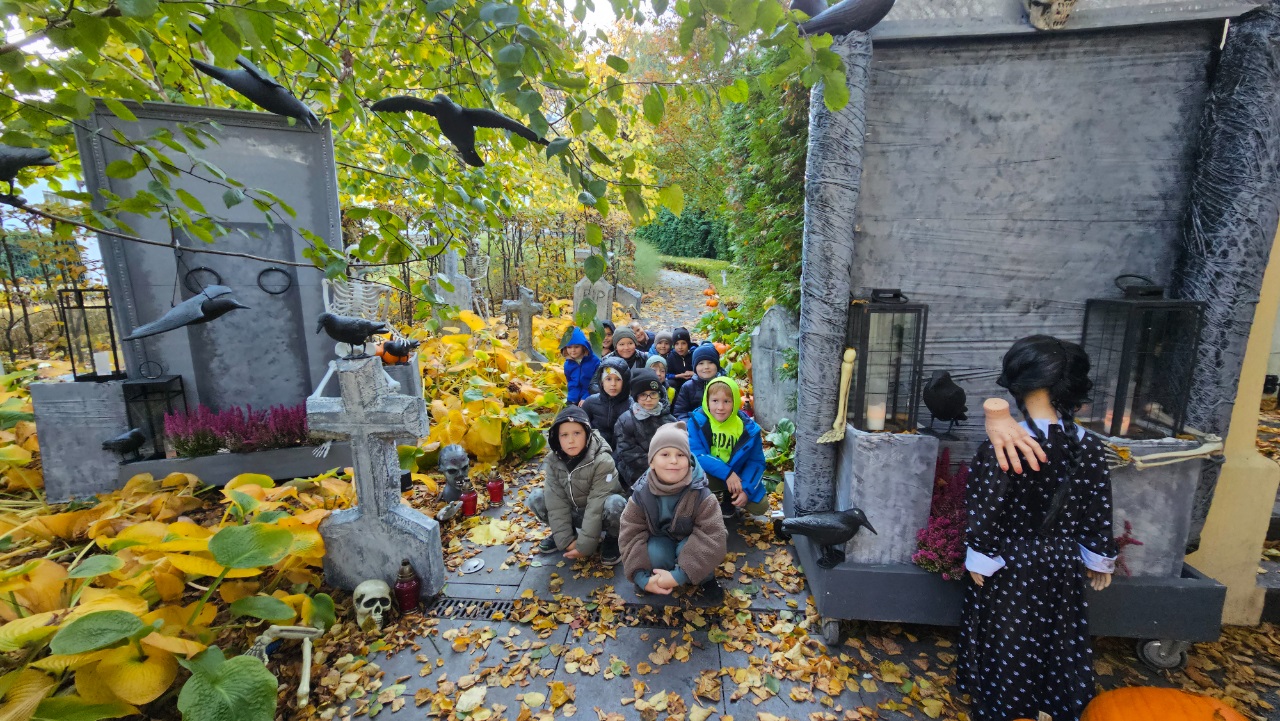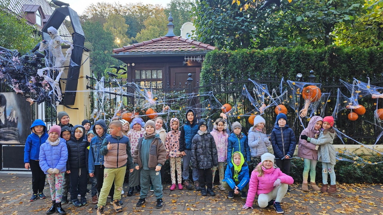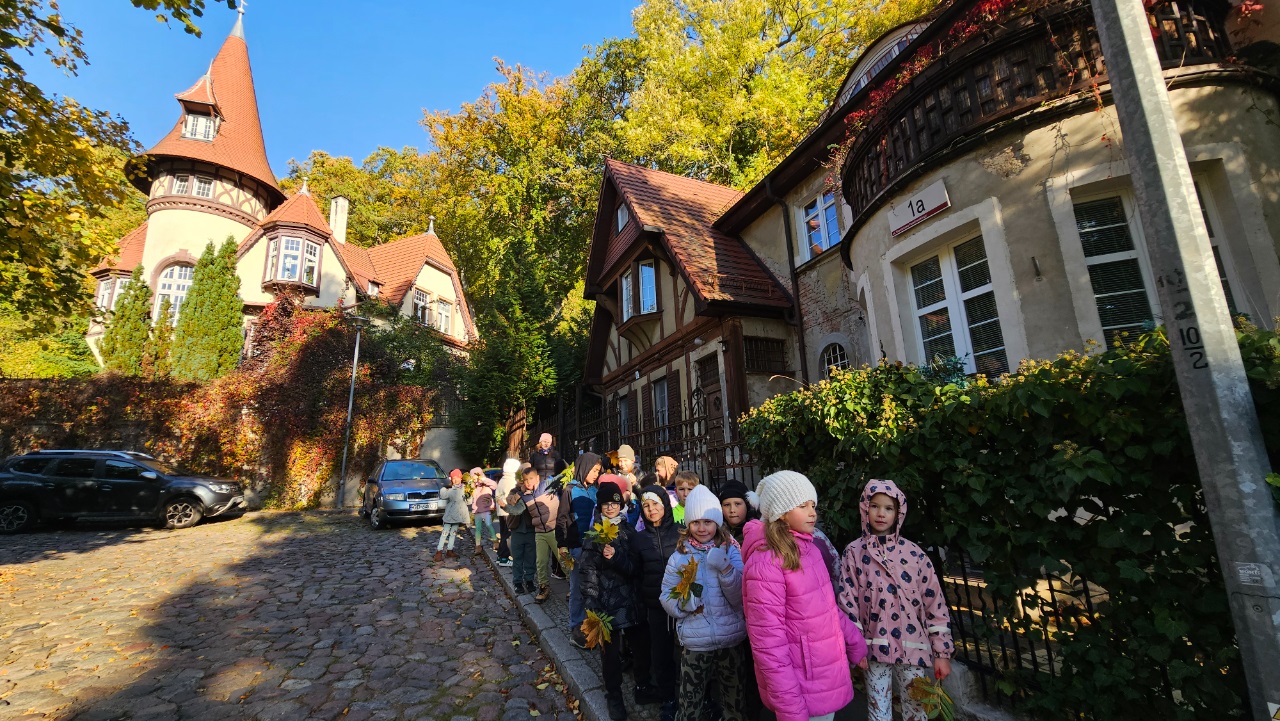 Uczniowie klasy 1a wybrali się na jesienny spacer edukacyjny. Uczyli się nazywać i rozpoznawać drzewa, ich liście i owoce. Przy okazji zawitaliśmy do Willi Kirsch na Jaśkowej Dolinie, gdzie przenieśliśmy się do świata Wednesday Addams. Do klasy wróciliśmy z jesiennymi skarbami.