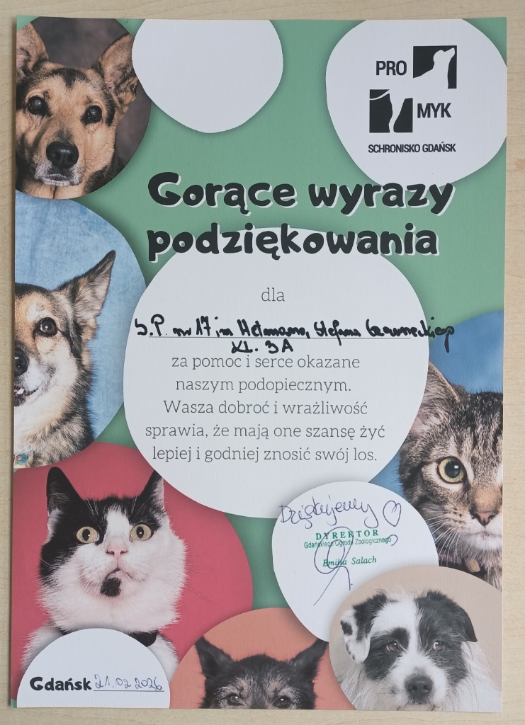 Podziękowanie dla klasy 3a od Schroniska Promyk - Szkoła Podstawowa nr 17 im. hetmana Stefana Czarnieckiego