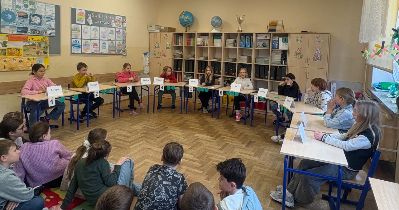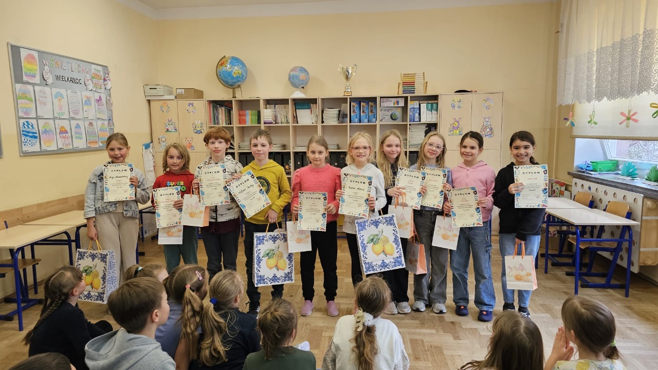 W czwartek 26 marca odbyła się czwarta edycja Szkolnego Konkursu Wiedzy „1 z 10” dla uczniów klas trzecich. Pierwszy etap miał charakter pisemnego testu eliminacyjnego. Do finału zakwalifikowało się 10 uczniów z najwyższymi wynikami punktowymi. Uczestnicy odpowiadali na pytania z różnych kategorii: matematyka, język polski, historia, geografia, zwierzęta, rośliny, kalendarz, muzyka, sport, ludzie, urządzenia, kalendarz, transport, budynki, ciało, misz masz, baśnie i bajki. Pytania miały różny stopień trudności. Do rundy finałowej przystąpiło trzech uczestników: Ala M., Iza M. oraz Stefan S. Laureatem Szkolnego Konkursu Wiedzy „1 z 10” została - Iza M. która wyróżniła się wysokim poziomem wiedzy z różnych dziedzin.
