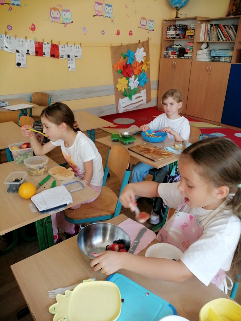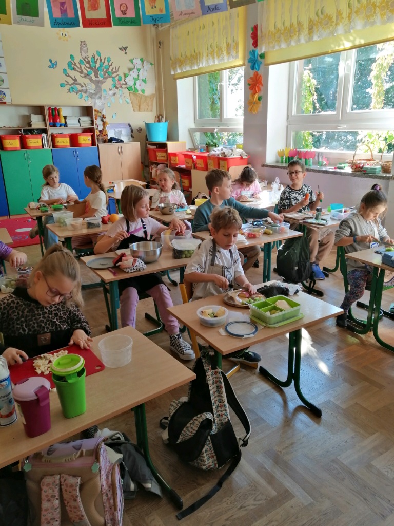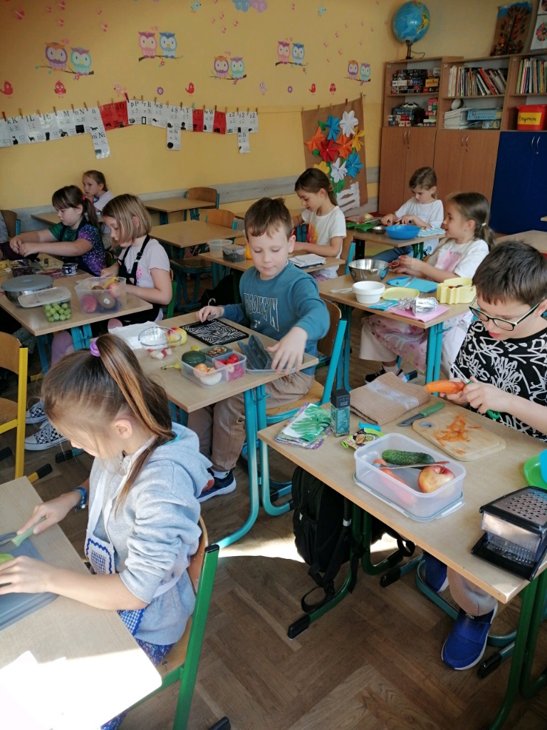 Uczniowie z 2a przygotowali pyszne surówki warzywo - owocowe rozpoczynając projekt "Zdrowo i sportowo"