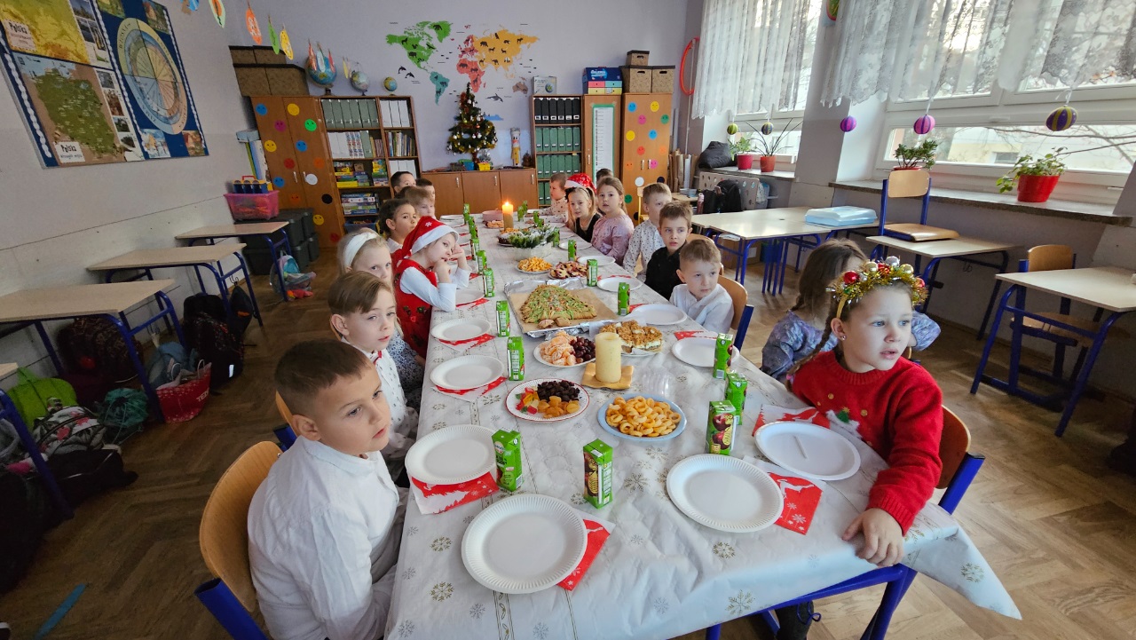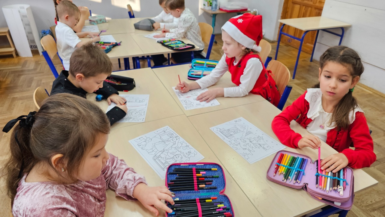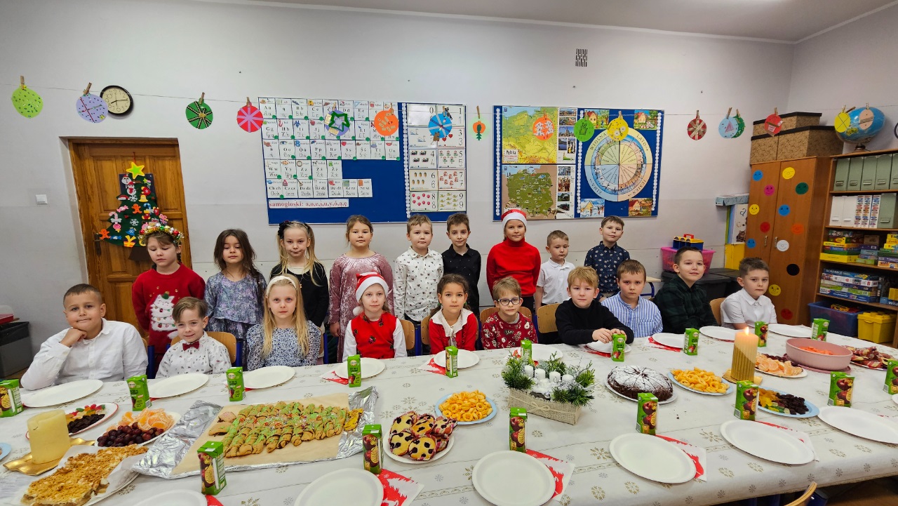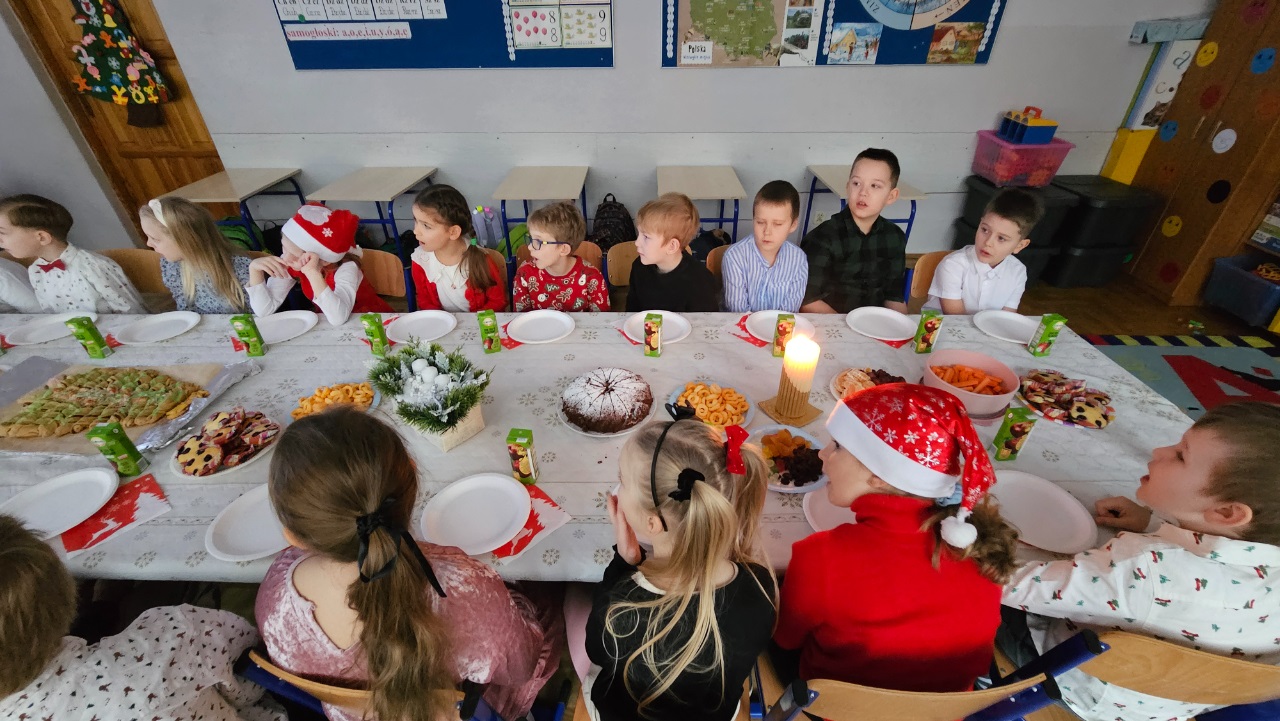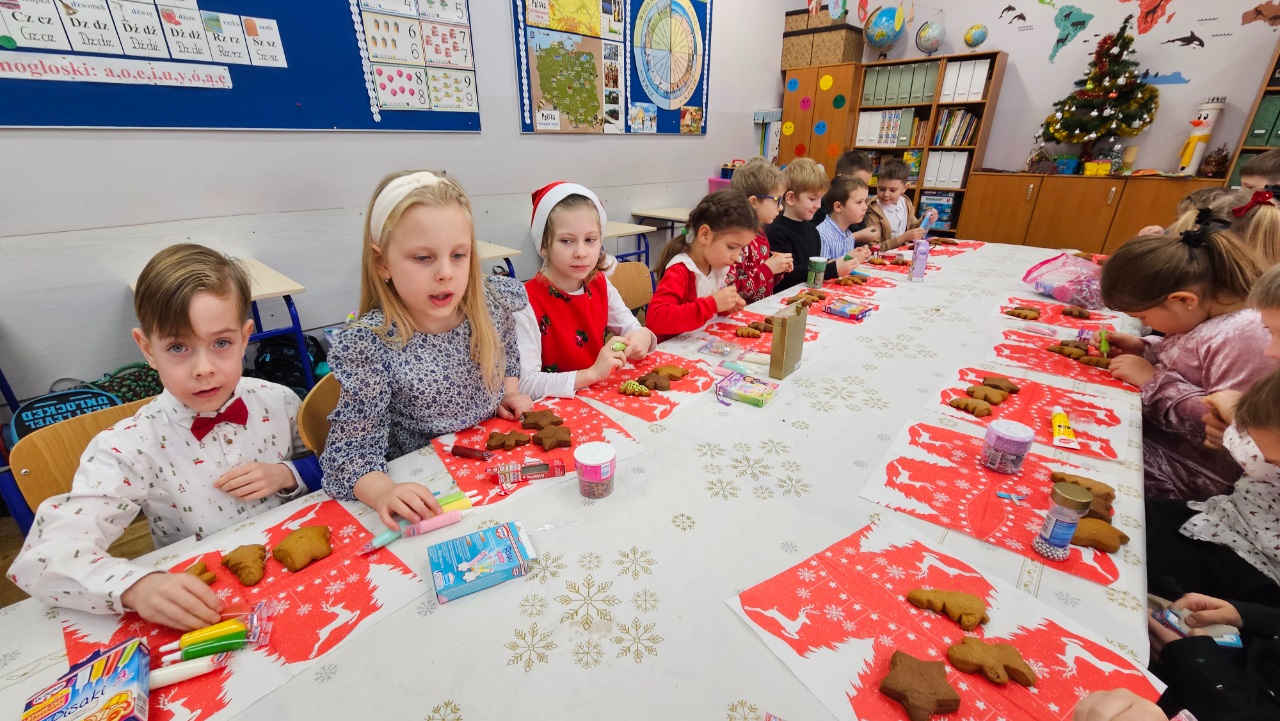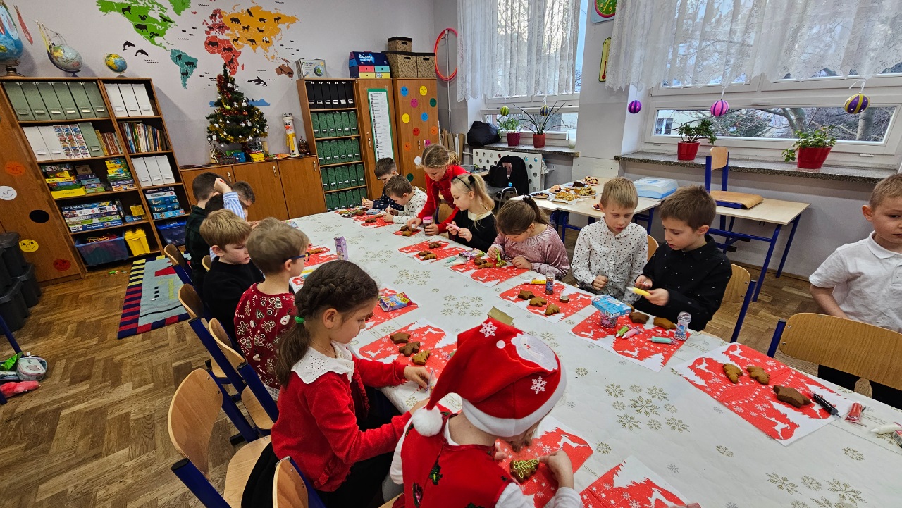Pierwsze spotkanie wigilijne upłynęło w miłej atmosferze. Było śpiewanie piosenek, kolęd i pastorałek, opowiadanie o zwyczajach i tradycjach świątecznych, degustacja smakołyków przyniesionych przez dzieci i składanie życzeń. Dużo pozytywnych emocji przyniosło dekorowanie pierniczków. Maluchy obejrzaly też film edukacyjny, a potem w zespołach wykonały kolorowankę świąteczną. Na zakończenie spotkania dzieci wymieniły się własnoręcznie wykonanym kartkami świątecznymi.